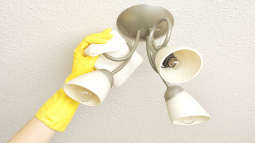 “When grime and dust gather on lights, it can make the whole room feel dark,” says Littlejohn. Before cleaning them, turn off the lights and power. “Then, if possible, take down the light fitting so it’s easier to clean, and rest it on a towel so it’s safe. Dust around the light fitting and ceiling fan.” For the light itself, glass or metal cleaners work particularly well on high-shine finishes, getting rid of greasy residue or smudges. “Hillmark Glass Kleen Wipes contain a special ingredient that removes dirt and grime – and the fabric of the wipe removes residue, leaving glass surfaces sparkling clean,” says Adeyinka. If your lights are crystal, avoid any moisture altogether, advises Littlejohn. “A delicate shot of canned air will prevent basic dust build-up,” she says. For fabric lightshades, “roll all over with a lint roller, and use a microfiber cloth on the rest of the shade to dust and get rid of dirt.”