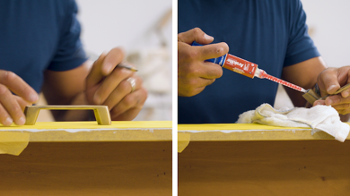 Step 3: Now to attach the wallpaper to the tallboy drawer with Selleys® Kwik Grip® Waterbased. It applies white so it’s easy to see but dries clear for a neat finish. Apply glue to the tallboy and to the wall paper. Then attach the wallpaper to the drawer. Use a paint roller to ensure your wallpaper is smooth. If any glue squeezes out, just clean it up with a cloth and some water. ![]() ![]() |