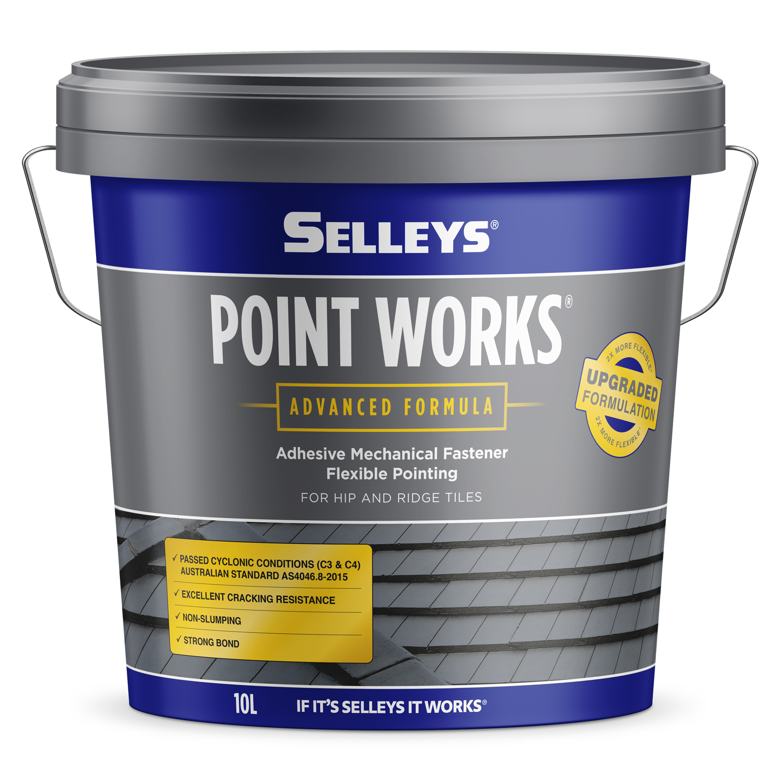 Selleys Point Works is a tile pointing compound applied with a trowel and used to fasten (point) hip and ridge roof tiles.