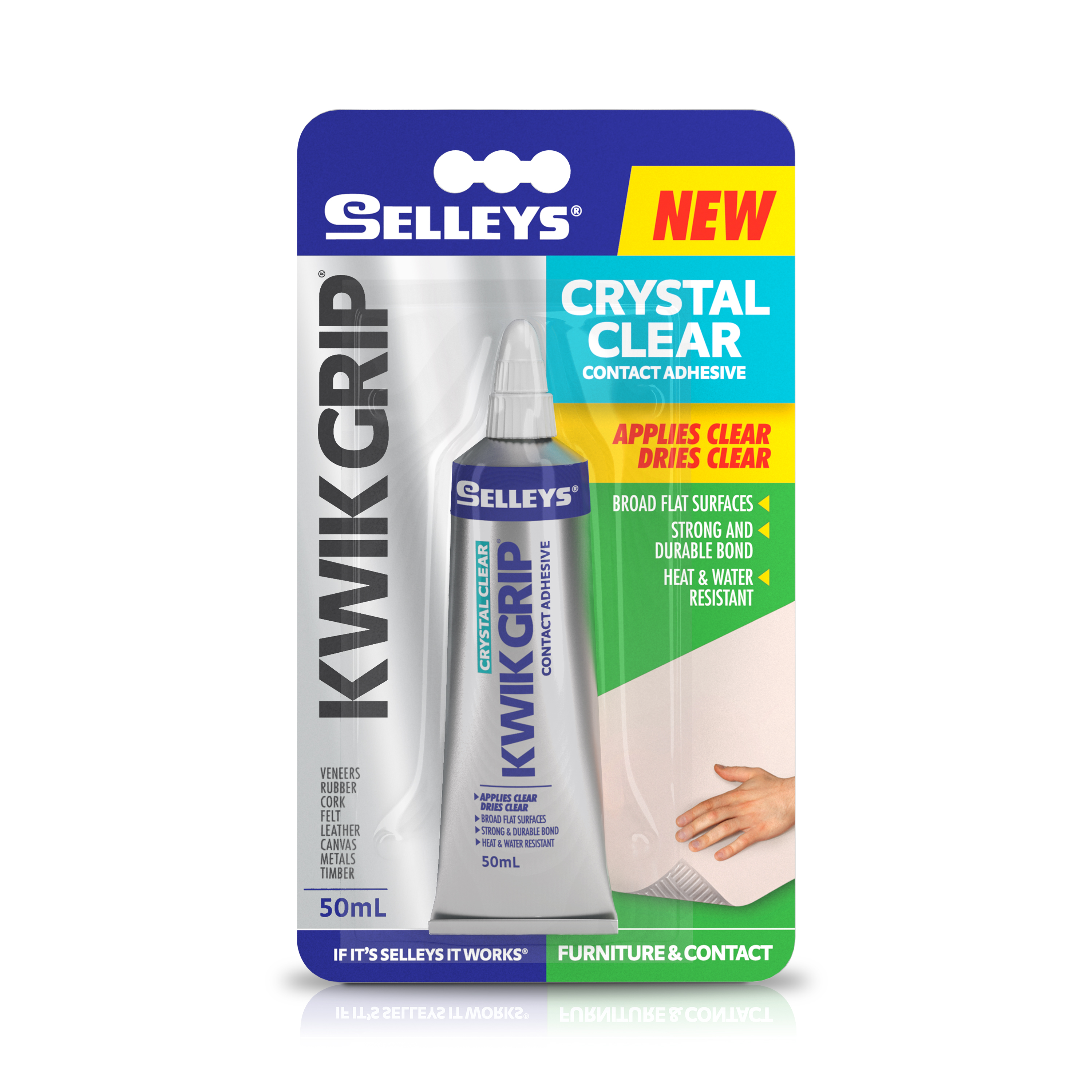 Selleys Kwik Grip® Crystal Clear applies clear and dries crystal clear for invisible bond lines. Excellent for achieving a clear finish when bonding large, flat, close-fitting surfaces.