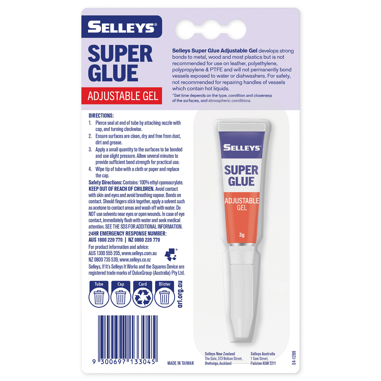 Selleys Super Glue Adjustable Gel is ideal for everyday household repairs. It sets in 30 seconds, allowing time for consumers to adjust their fix to perfectly align their break. It's easy to use, requires no mixing and offers excellent adhesion to a variety of substrates.