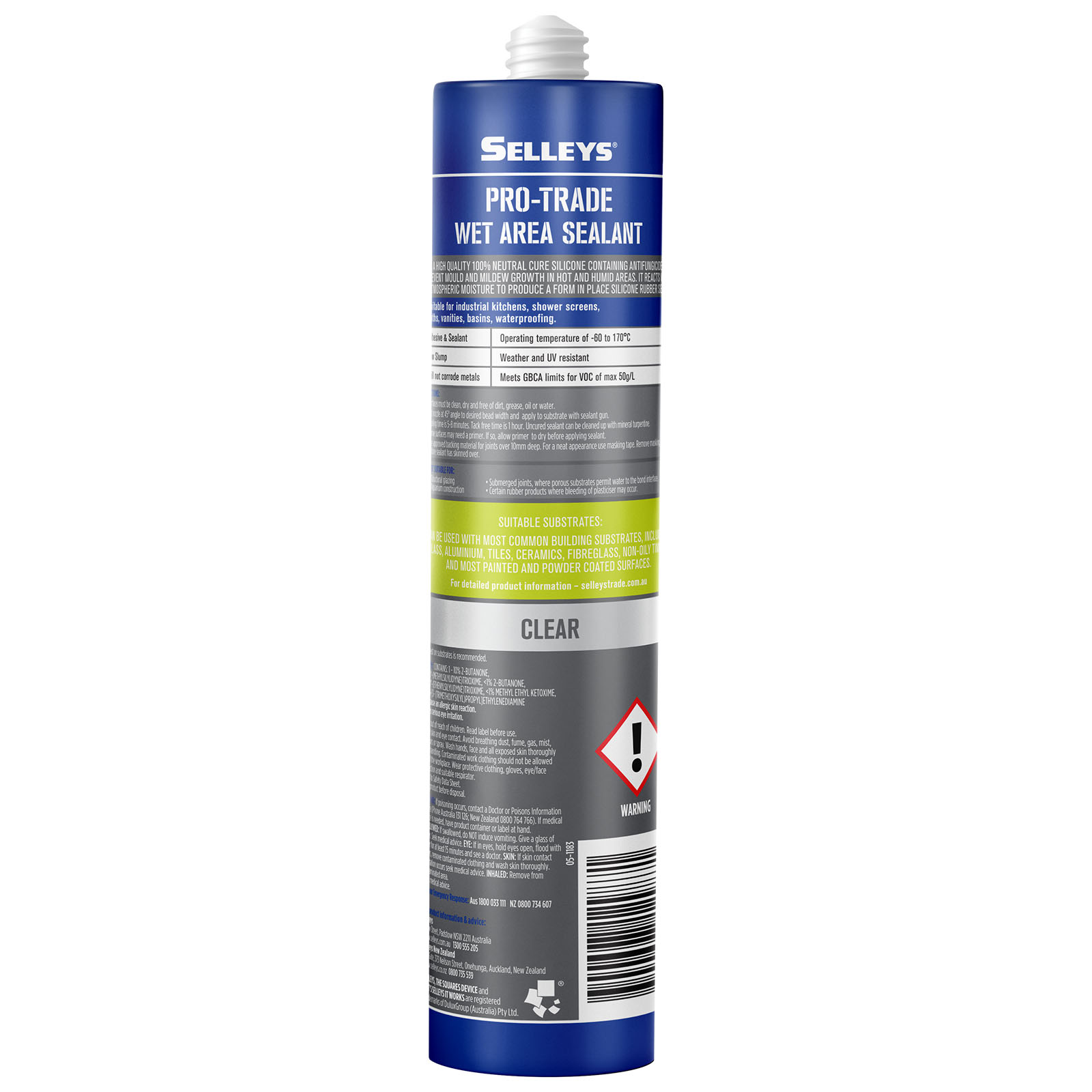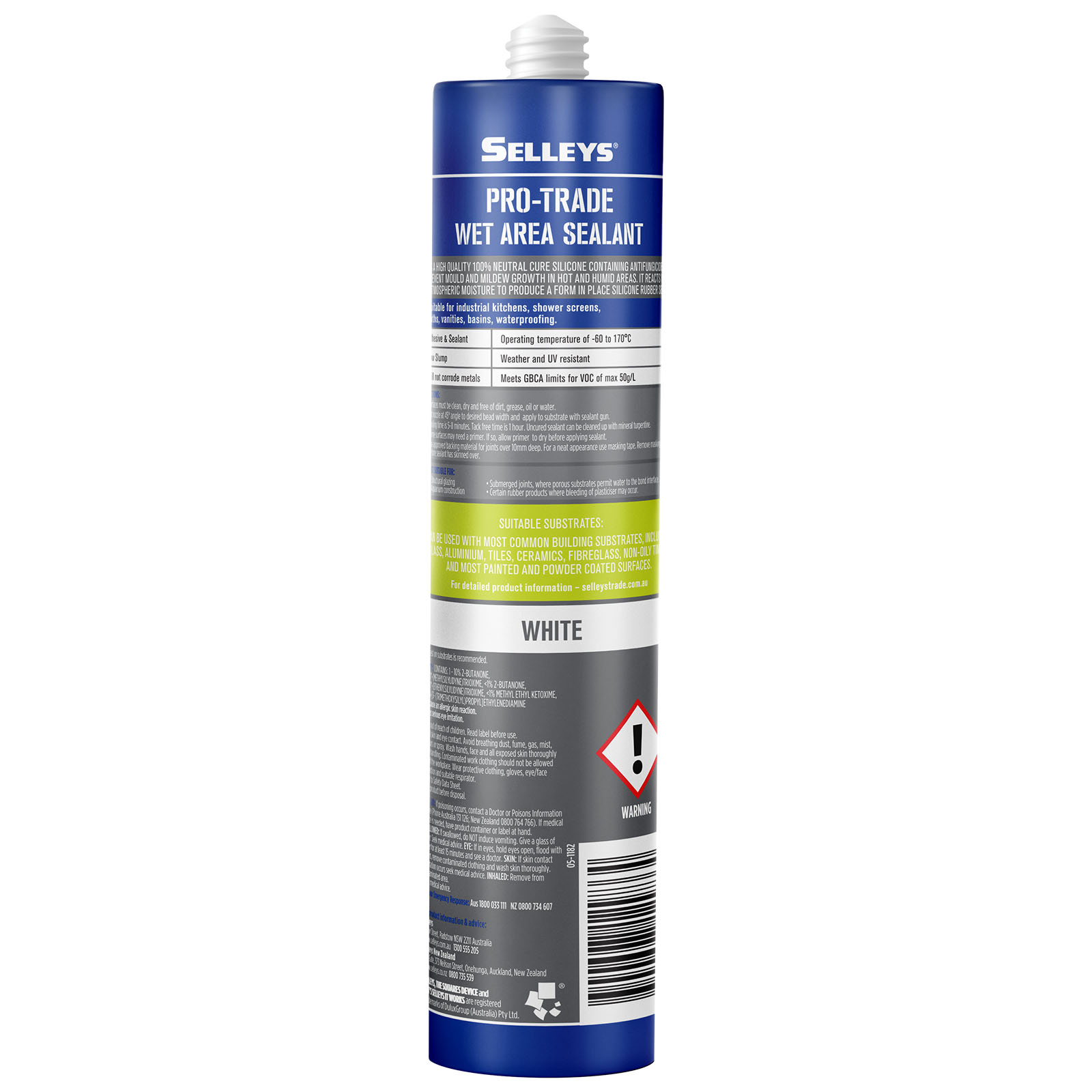 Selleys Pro Trade Wet Area Silicone is a high quality, 100% neutral cure silicone containing anti-fungicide to prevent mould and mildew growth in hot and humid areas.